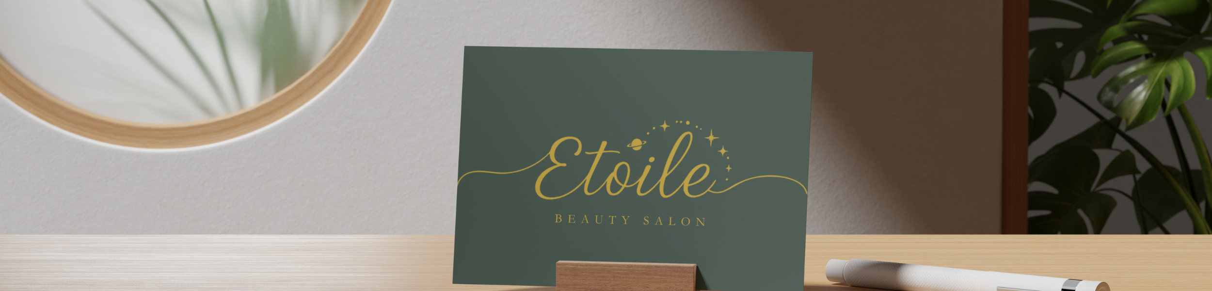 「Etoile(エトワール)」=フランス語で“星”を意味し、 「輝くあなたを引き出す場所」をテーマにした架空のプライベートサロンの名刺およびロゴをデザインしました。 上質さとやさしさを両立させた、洗練された印象のビジュアルに仕上げています。