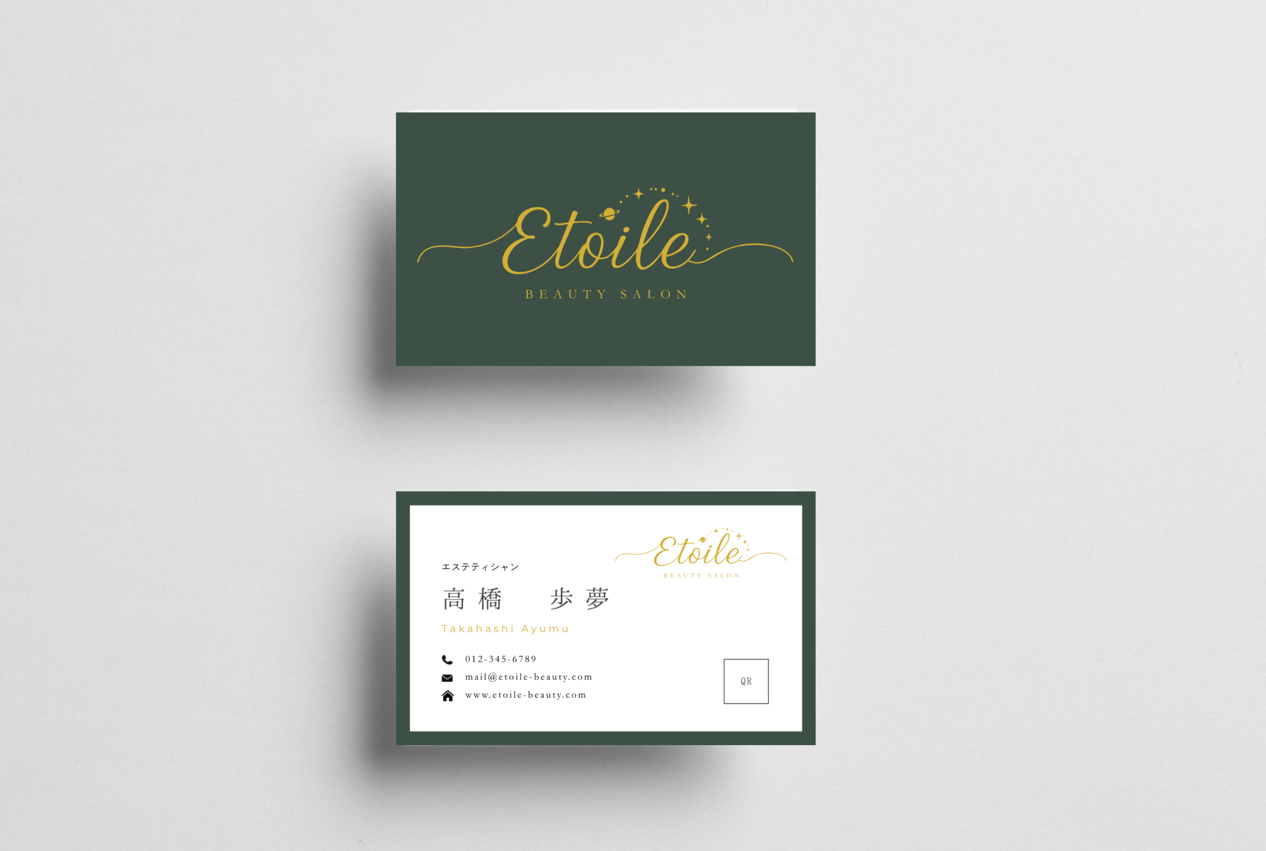 「Etoile(エトワール)」=フランス語で“星”を意味し、 「輝くあなたを引き出す場所」をテーマにした架空のプライベートサロンの名刺およびロゴをデザインしました。 上質さとやさしさを両立させた、洗練された印象のビジュアルに仕上げています。